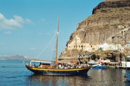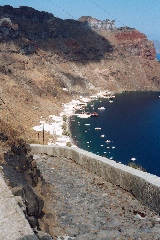 Uitzicht op de baai van Thirasiá. De boot blijft gewoonlijk 2 uur op Thirasiá, zodat je de gelegenheid hebt om rustig boven te eten. Reken 20 minuten om de trap weer af te dalen. De rest van de tocht voert ons naar Ia, waar we een mooi uitzicht krijgen op de roodbruine rotsen van de caldera. Ben je nog niet in Ia geweest, dan kun je de schipper vragen hier uit te stappen - het is gewoonlijk rond 5 uur in de namiddag, en je hebt nog goed de tijd om naar boven te wandelen en naar de zonsondergang te gaan kijken - voor je de bus terug naar Firà neemt. Het eenvoudigste is natuurlijk met de boot naar het haventje van Firà terug te keren, waar je normaal rond half zes terug bent. De tocht omhoog kun je met het kabelspoor of met een ezel of te voet doen... Te voet duurt dat in een rustig tempo drie kwartier. Voor