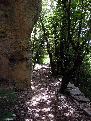 Le sentier poursuit au pied d' une paroi rocheuse impressionnante. (0h08)) Le sentier bifurque après encore 2-3 minutes: le sentier de droite conduit vers Kapésovo (petit panneau) – voir la promenade Kapésovo – Kípi et retour -, nous allons à gauche (panneau). Le beau sentier devient assez vite une vraie skála, avec des marches basses et des virages.