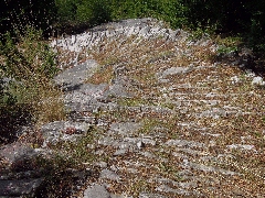 plupart du temps à quelque 10-15 mètres au-dessus du lit de la rivière. (1h45) Plus loin, nous descendons jusqu’ à la hauteur du lit: ici, nous devons passer à gauche à travers un muret (petit triangle rouge), mais le sentier poursuit ensuite à droite, d’ abord le long du muret, puis juste à côté du lit. Un peu plus loin, nous passons encore à travers une brèche: le beau sentier forestier continue parfois à côté de murets, et aussi à côté de la paroi rocheuse raide.