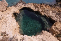 De "swimming pool", min of meer in de vorm van een hart. We keren terug naar het eigenlijke pad, dat verder een vrij vaag, rotsachtig spoor wordt; het loopt ook voorbij enkele mooie inhammetjes. (2u07) Zo komen we links van een metalen afsluiting en passeren weer naast heel mooie rotsformaties. We komen aan het kleine strandje van Italída, steken weer een kaap over en wandelen weer langs een afsluiting, daarna een muur - we komen op een tweede strand, dat van Fános. (2u20) Het zandige pad loopt