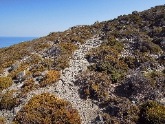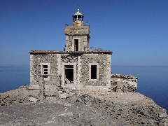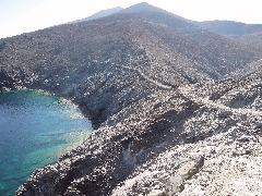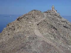 Le phare sur le cap Papárgyros. (0h42) Pour le chemin du retour, nous descendons d' abord en 2 minutes jusqu' à la bifurcation où un sentier continue tout droit vers la route, tandis que notre sentier poursuit à droite. Ce sentier est pierreux et continue dans un paysage désolé. Nous parvenons ainsi tout en haut, au-dessus de la mer et d' une vallée rocheuse; ensuite, nous descendons dans la vallée et nous la suivons quelques instants à gauche.