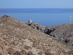 de la tache blanche - ne descendez donc pas trop vite à droite... (0h30) Si nous prenons à droite près du premier cairn, nous parvenons après une descente difficile de 7-8 minutes dans le lit de la rivière, que nous pouvons suivre facilement à gauche. Après 4 minutes, nous arrivons devant une autre gorge: nous y montons pour quelques moments à gauche, puis nous redescendons à droite - et c' est alors que nous voyons un évident sentier qui sort à droite du lit. Ce sentier est clair, mais très pierreux, et continue maintenant tout droit vers le phare. ![]() Le sentier est maintenant très clair. Après 6-7 minutes, nous débouchons sur le sentier qui vient de droite de la route; il nous faut maintenant continuer à gauche pendant encore quelques minutes. ![]() Nous nous approchons du phare... (0h42) Nous arrivons ainsi près de la ruine du phare typique, comme il y en a tant en Grèce. Il est très agréable de se reposer à l' ombre du phare, sur le cap Papárgyros. A gauche, nous voyons Mýkonos, et tout à fait à droite Andros.