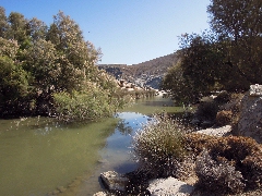 promenade [1] à Falatádos - ce qui témoigne d' un grand optimisme... L' embouchure de la rivière entre le restaurant et la plage est un lieu idyllique et parfois l' eau est abondante. Nous atteignons une splendide plage à galets, avec de vieux tamaris. Le jeu de l' eau de la rivière qui se jette dans la mer et les vagues parfois furieuses, tout cela forme un spectacle magnifique. Par beau temps tranquille, il est très agréable de se baigner.