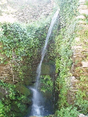 into concrete again. Soon thereafter you reach a curve and you notice the trail marker [1] twice, just before two small bridges. You continue straight ahead, across the first bridge, but BEFORE the second bridge you take a green trail off the left (no indications!). This trail leads you through a green valley and it goes up. After a little under a minute you see a small water fall, on your left and on a very shaded spot.